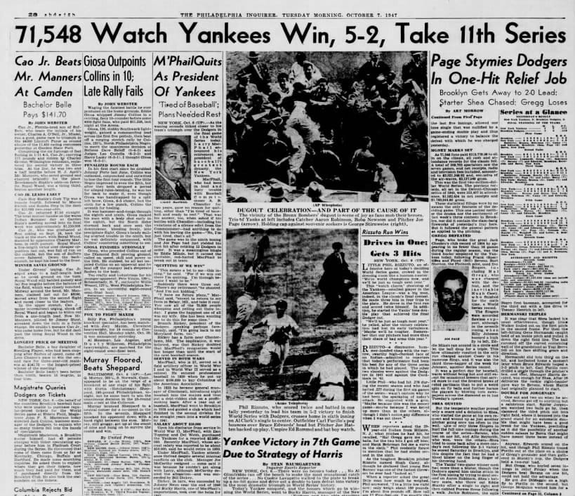 Page retired the first 13 batters he faced until Miksis singled in the ninth, but by then the Yankees had opened a 5-2 lead. With Miksis on first, Page induced Edwards to hit into a Series-ending double play, Rizzuto to Stirnweiss to McQuinn.