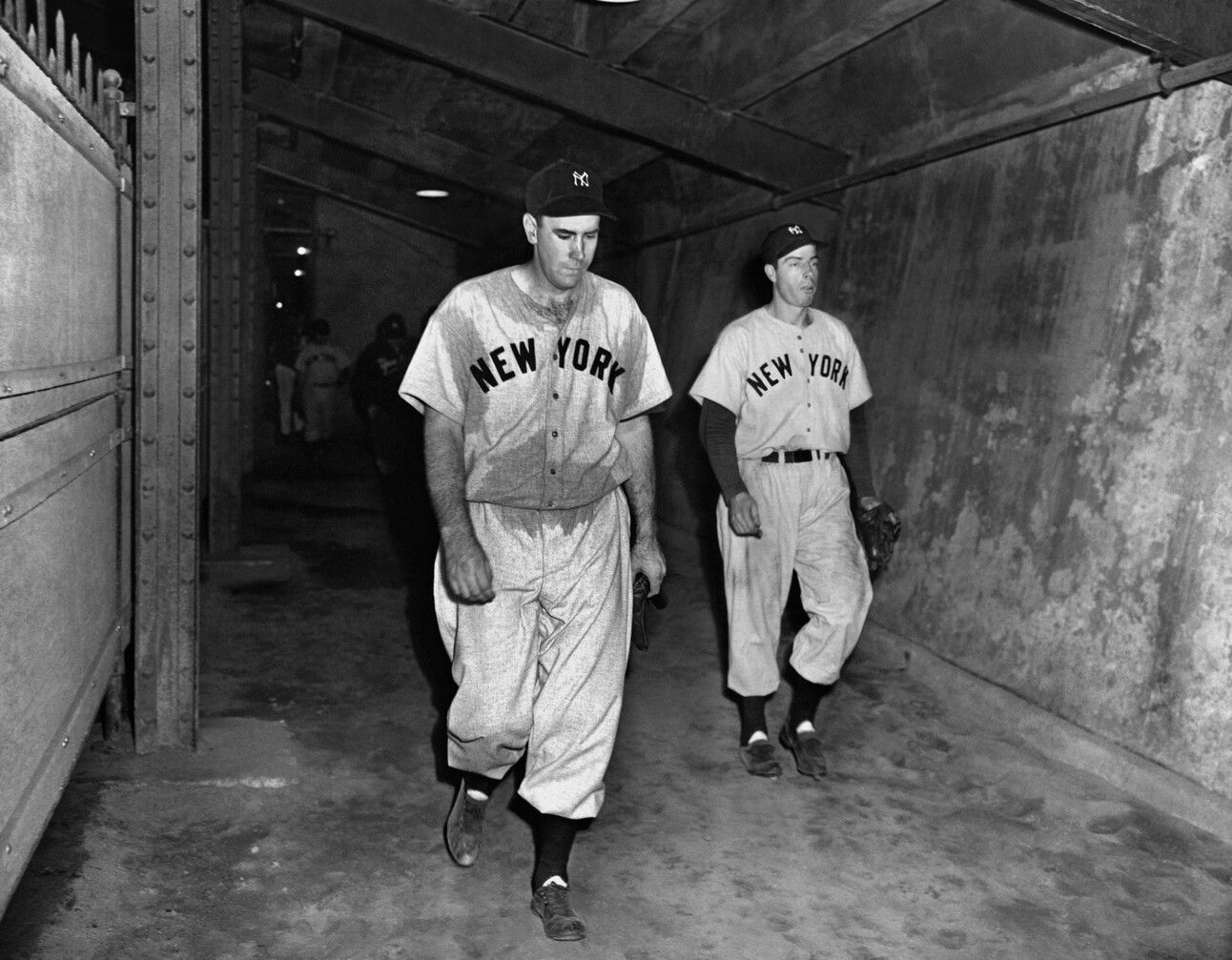 Bill Bevens and Joe DiMaggio head to the clubhouse after the Yankees’ loss in Game Four of the 1947 World Series.