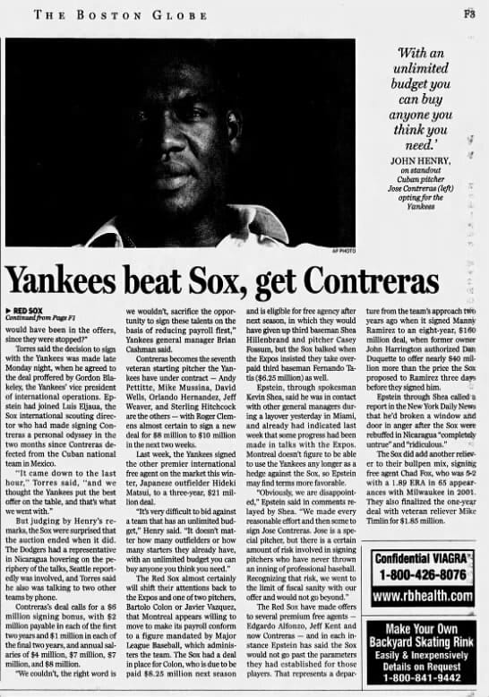 And when they flipped to the respective sports sections of the city’s competing dailies, they were greeted with the jarring news that Cuban defector Jose Contreras, a right-handed pitcher who was coveted by the Red Sox and was, at least reportedly, close to signing with Boston, would not be doing so.