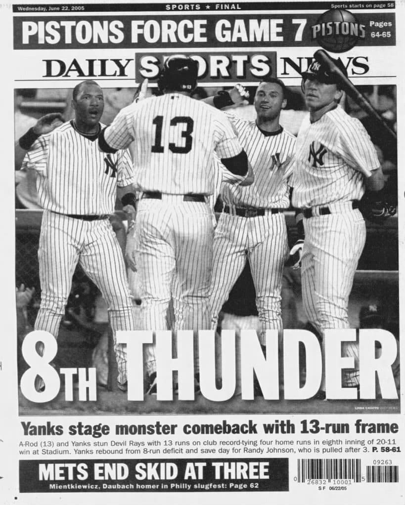 ➤ June 21, 2005: After building a 10-2 lead at Yankee Stadium by rocking Randy Johnson for seven runs inside three innings, the Rays probably thought they were on their way to a rare celebration inside the visiting clubhouse at Yankee Stadium, this back in the glorious days when the Rays were one of the worst teams in baseball.