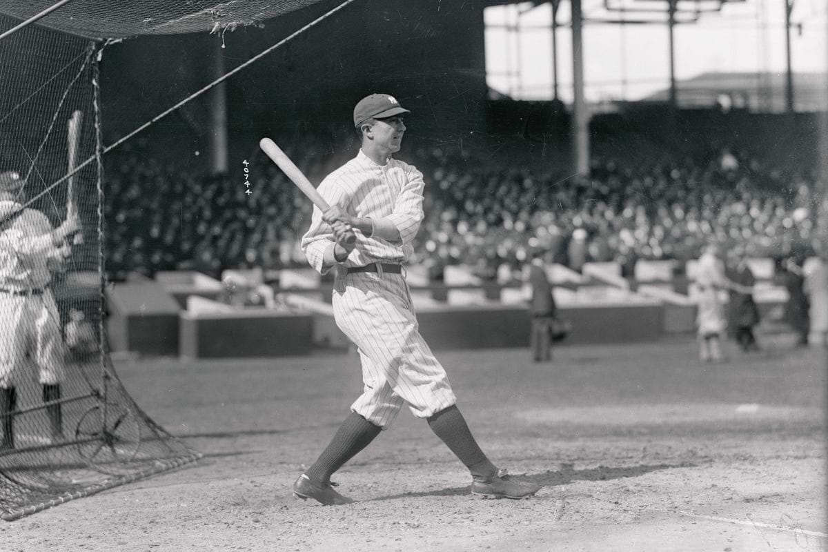 Frank “Home Run” Baker taking batting practice at the Polo Grounds.