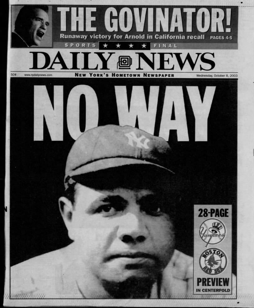 On the morning of Oct. 8, 2003, Game 1 of the American League Championship Series between baseball’s most bitter rivals, the front page of the New York Daily News - the front page, not the back page which was usually reserved for sports hyperbole - contained only this: A picture of Babe Ruth with the simple headline “No Way.”
