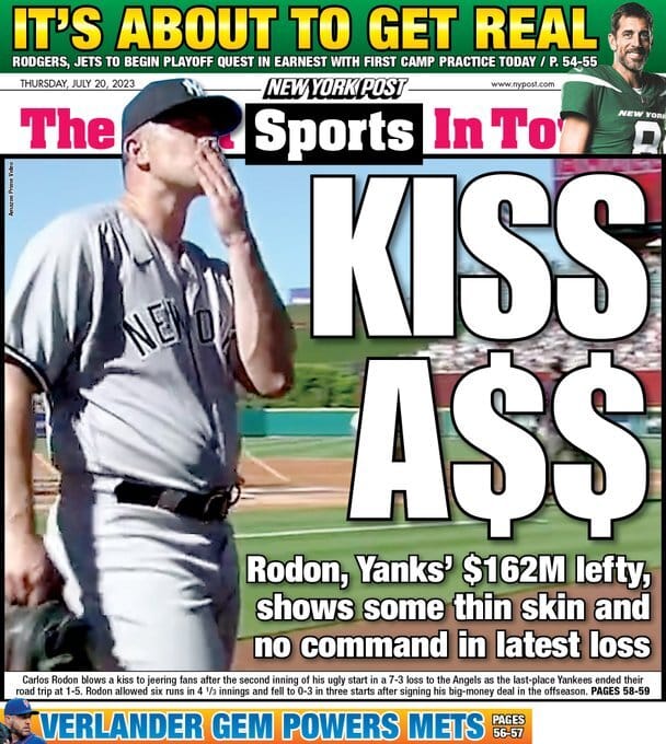 ➤ The Yankees waited more than three months for Carlos Rodon - the big offseason free agent signing - to make his injury-delayed debut, and when it finally happened, so many people thought that he was going to be able to provide a lift to a team that desperately needed another reliable weapon in the rotation. Three starts into his pinstripe career, he has absolutely sucked. He’s now 0-3 with a 7.36 ERA after this absurdly bad performance. Rodon gave up two runs in each of the first three innings and when Boone finally yanked him in the fifth, he had allowed those six runs on four hits and five walks.