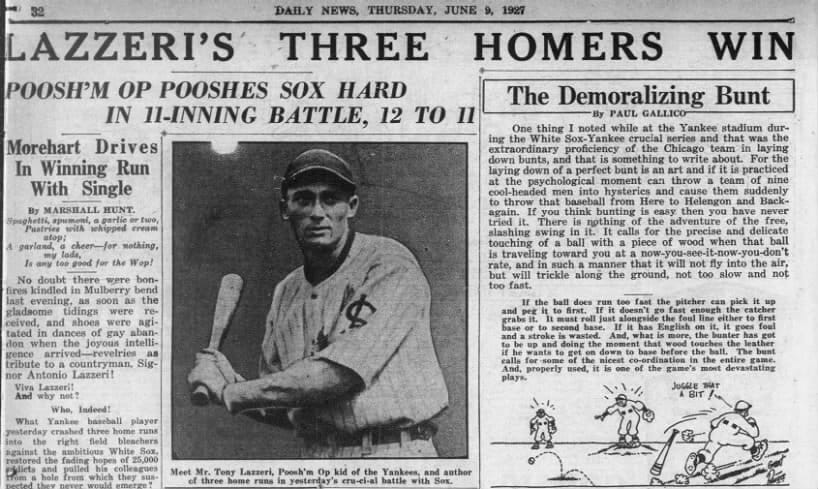 In a wild game at Yankee Stadium that featured 23 runs, 34 hits and 15 walks, all of which took three hours and 15 minutes which was an eternity in those days, Lazzeri carried the Yankees to a 12-11 victory over the White Sox.